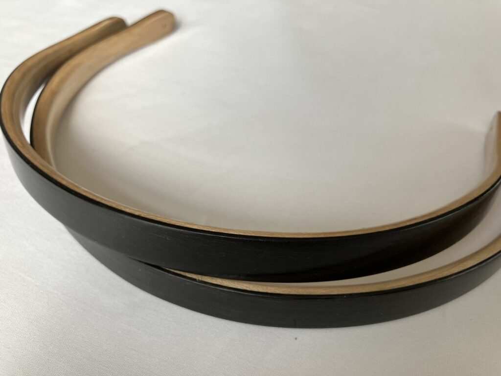 9″バスケットのハンドル。1枚目は普通の形、2枚目は腕が掛かるコブ付きのMartin Brown型です。材はメープル、ウォルナット、チェリーです。